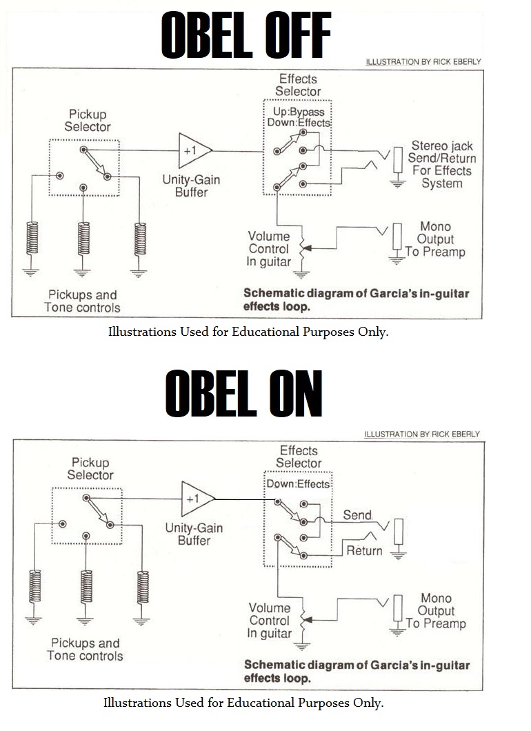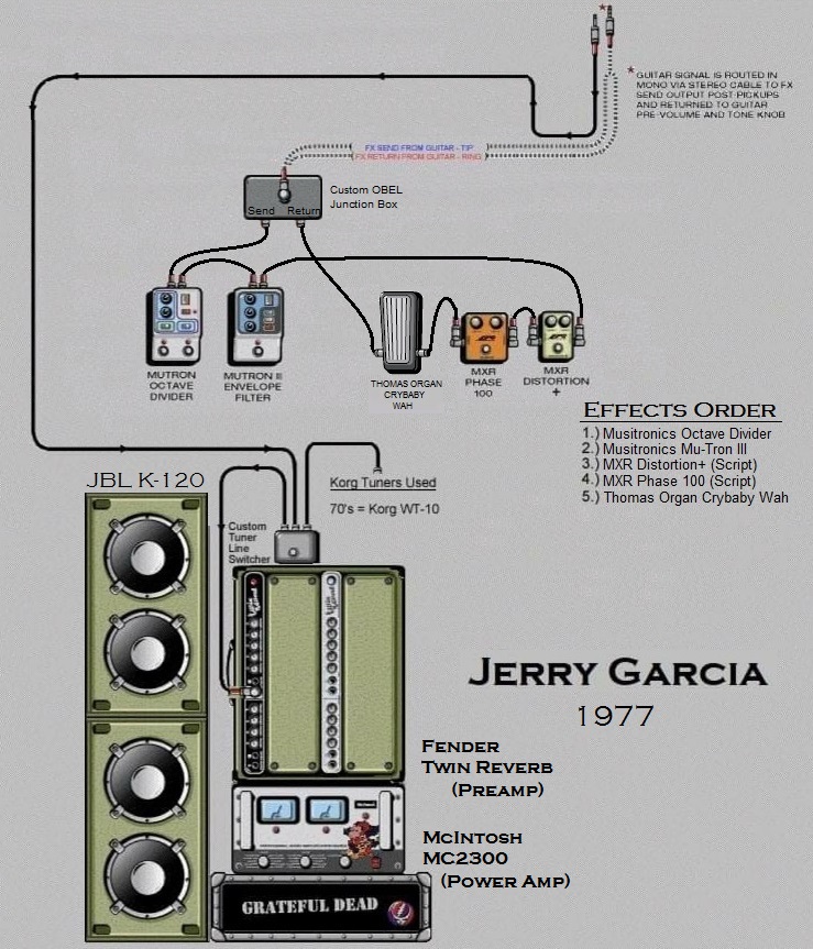Jerry began to use more effects other than a Colorsound Wah, possible Univox Wah or Morley Fuzz Wah used prior to 1976. On December 31, 1976 his OBEL(OnBoard Effects Loop) and Jfet Buffer in his Travis Bean 500 #12 arrives. With the new Buffered OBEL on his guitar he started to incorporate more effects units into his rig.