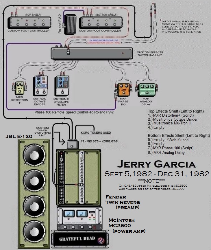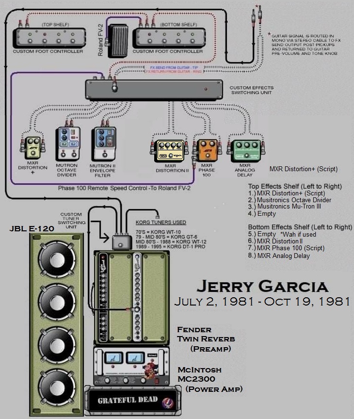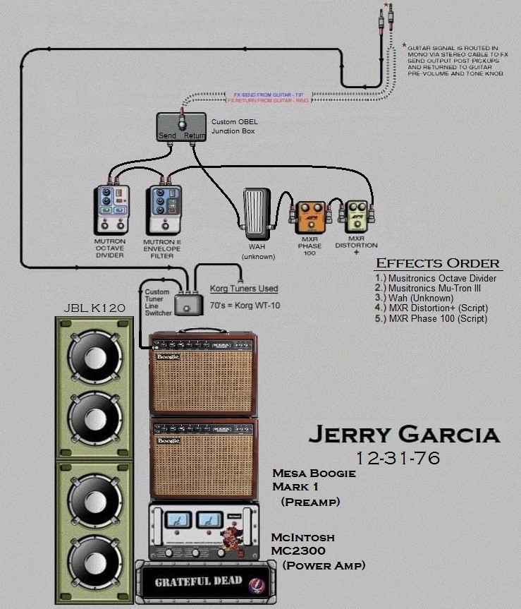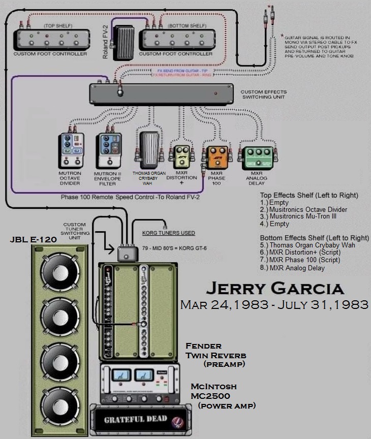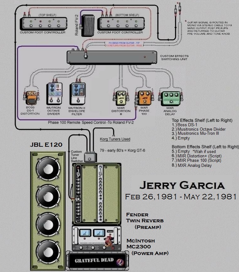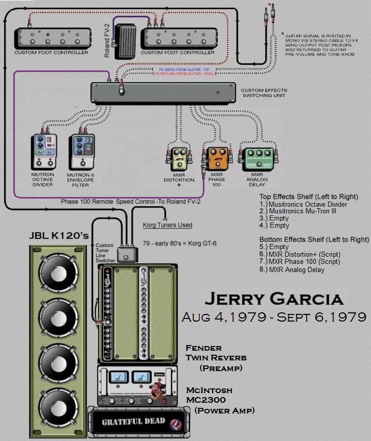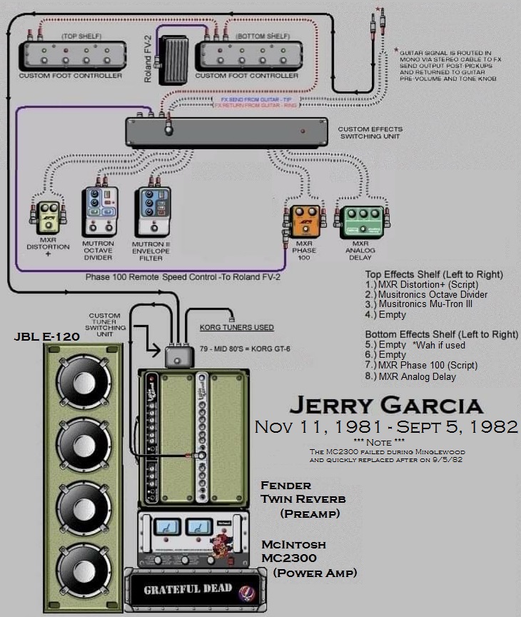 "All those gadgets are voltage-sensitive. If you have them after the volume control their behavior is affected by the loudness setting on the guitar. With my system, on the other hand, the effects always see the guitar as if it had full output voltage. The effects are also controlled by a DC power supply rather than batteries. Since the effects' input voltage- the guitar's output- is always fixed, they behave exactly the way I want them to. The whole thing is so stable that it's completely repeatable in every situation, and I never run into a weirdness of any sort. I'd used effects in recording before, but they were always too unstable for me to use onstage until we came up with this." - Jerry Garcia ~ Guitar Player Magazine October 1978