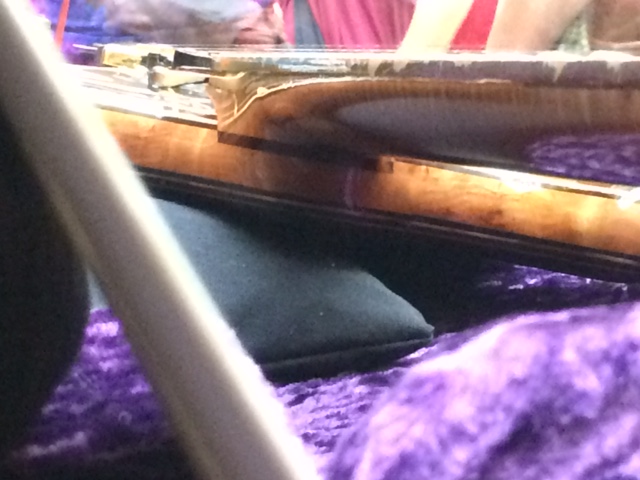 are thin layers of paduk, purpleheart, and brass. The maple neck has a