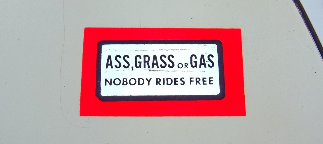 Ass, Grass or Gas Nobody Rides For Free Sticker added on top of the remnants of the previous sticker.