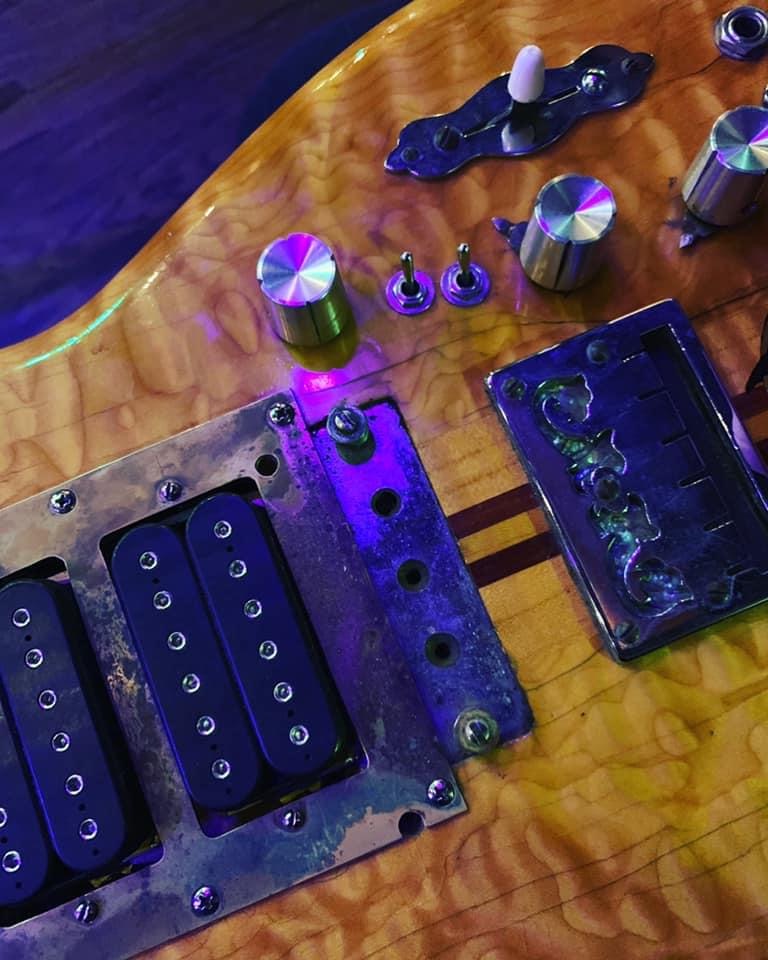 The Tailpiece gets Chrome plated and lowered onto the body of the guitar and rout made for string ball ends and a piece of Mother of Pearl was placed under it's decorative design.