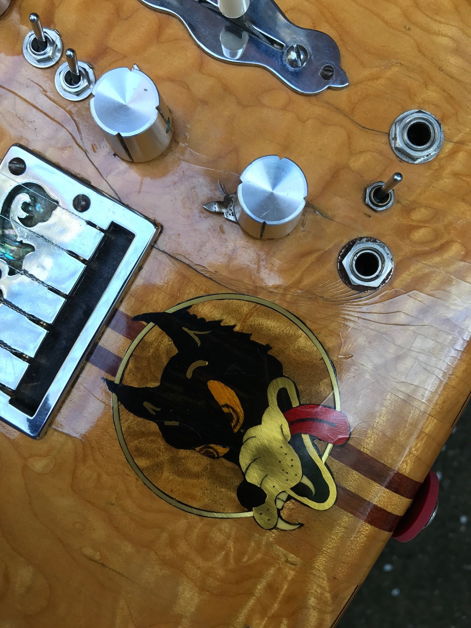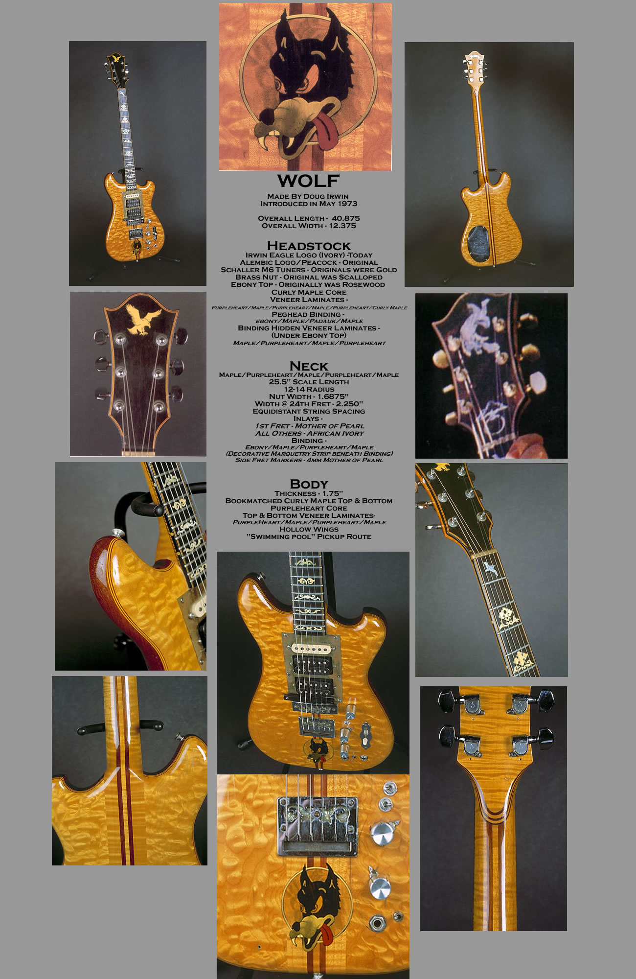 The original headstocks inlayed Peacock and Alembic logo were removed and Irwin Eagle Eagle Logo Inlayed on the repaired Headstock.